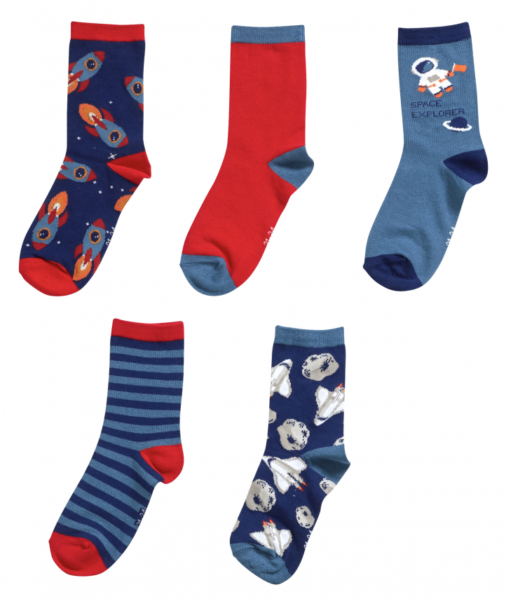 5 paar sokken voor jongens. De sokken zijn een standaard hoog model en zijn voorzien van een elastische, ribgebreide boord. Per paar verfraaid met een mooi dessin. De sokken hebben een aansluitende pasvorm en dragen comfortabel dankzij de luchtige stoffenmix met 75% katoen.