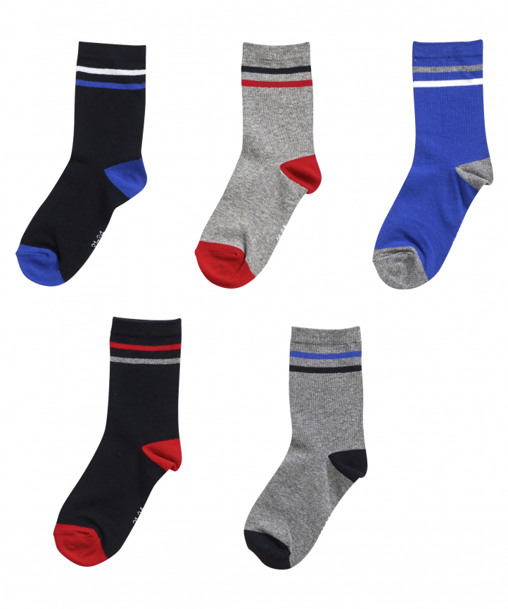 5 paar sokken voor jongens. De sokken zijn een standaard hoog model en zijn voorzien van een elastische, ribgebreide boord. Per paar verfraaid met een mooi dessin. De sokken hebben een aansluitende pasvorm en dragen comfortabel dankzij de luchtige stoffenmix met 75% katoen.