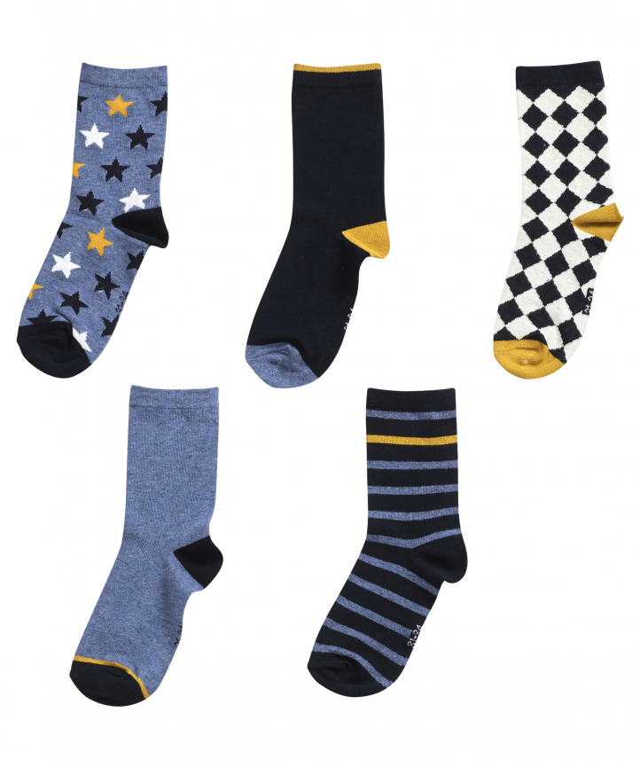 5 paar sokken voor jongens. De sokken zijn een standaard hoog model en zijn voorzien van een elastische, ribgebreide boord. Per paar verfraaid met een mooi dessin. De sokken hebben een aansluitende pasvorm en dragen comfortabel dankzij de luchtige stoffenmix met 75% katoen.