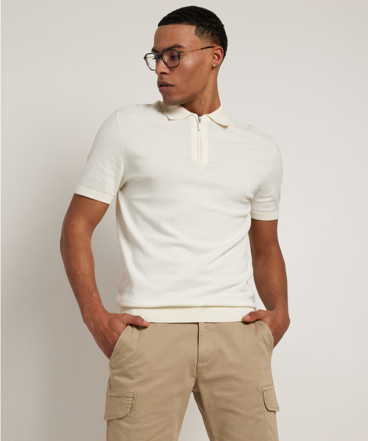 Polo voor heren van het merk Comodo. De polo is voorzien van een kraag met ritssluiting aan de voorkant, korte mouwen en ribgebreide boorden. Verfraaid met een uni off-white kleur. De polo heeft een regular fit pasvorm en draagt comfortabel dankzij de fijngebreide stof van 100% extra fijn katoen.