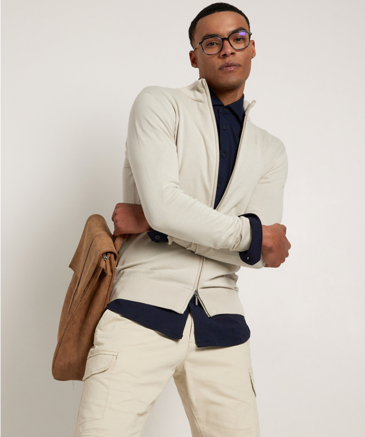 Vest voor heren van het merk Comodo. Het vest is voorzien van een opstaande kraag, een dubbele ritssluiting, lange mouwen en ribgebreide boorden. Verfraaid met een uni beige kleur en een klein geborduurd Comodo-logo. Het vest heeft een wat aansluitende pasvorm en draagt comfortabel dankzij de fijngebreide stof van 100% extra fijn katoen.