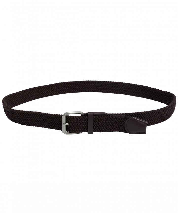 Riem voor heren. De riem is een elastisch gevlochten model en is voorzien van een vierkante gespsluiting en een leren details. Verfraaid met een bruine kleur. De riem heeft lengte van 120cm.