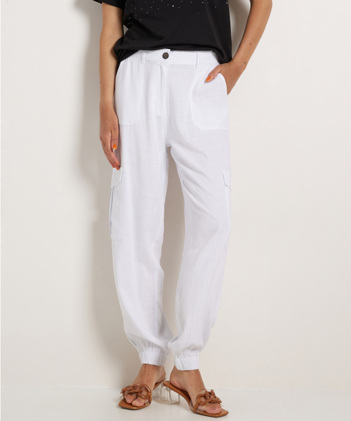 Broek voor dames. De broek is een cargo model en is voorzien van twee zijzakken, riemlussen, elastische boorden aan de onderkant en een knoop- met ritssluiting. Verfraaid met een uni witte kleur en linnenlook. De broek heeft een loose fit pasvorm en draagt comfortabel dankzij de luchtige stoffenmix.