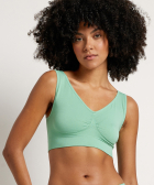 Beha voor dames. De beha is een naadloos model en is voorzien van een v-hals en brede schouderbanden. Verfraaid met een uni groene kleur. De beha heeft een aansluitende pasvorm en draagt comfortabel dankzij de soepele en gladde stof.