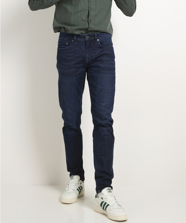 Jeans voor heren. De jeans is een 5-pocket model en is voorzien van een rits- met knoopsluiting, riemlussen en broekzakken. Verfraaid met een donkerblauwe denimwassing. De jeans heeft een slim fit pasvorm en draagt comfortabel dankzij de stretch denim stof.