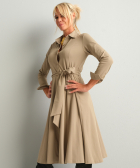 Travelstof jurk voor dames. Deze zwarte jurk is ontworpen met een kraag en een doorlopende knoopsluiting aan de voorkant. De jurk heeft taillelussen en een bijpassende ceintuur voor een vrouwelijke pasvorm. De lange mouwen zijn voorzien van manchetten. Met een wijd uitlopende pasvorm biedt deze jurk comfort en gemak. De travelstof is eenvoudig te onderhouden, droogt snel en heeft stevige stretch. Een stijlvol item uit de travelstof collectie van Nicolette Kluijver.