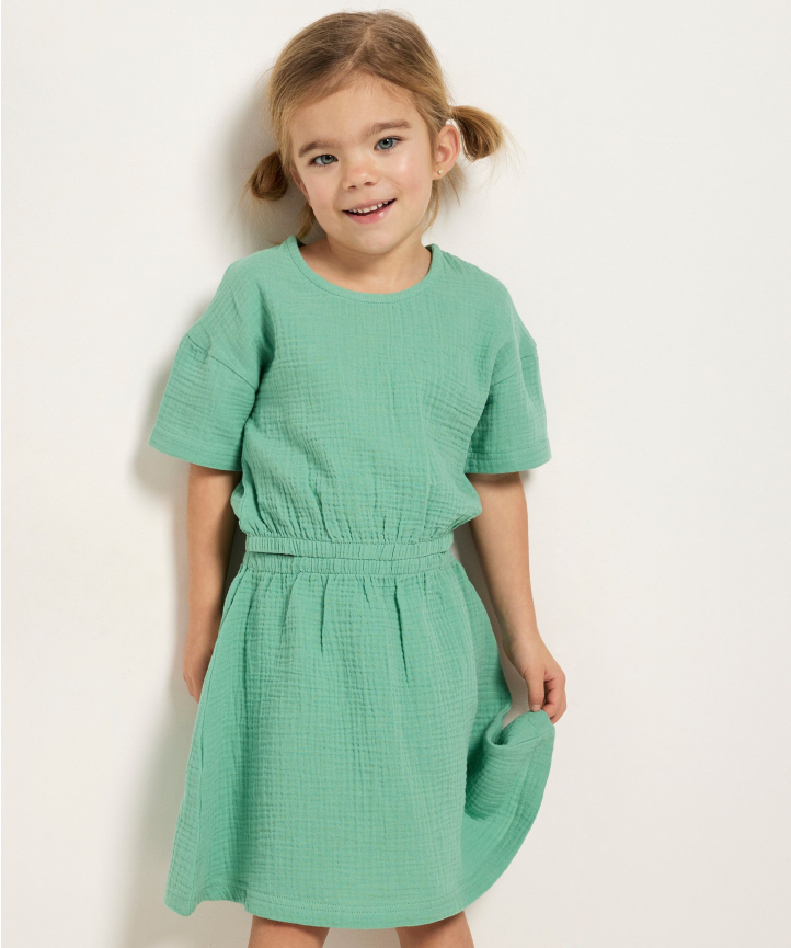Jurk voor meisjes. De jurk is een kort model en is voorzien van korte mouwen, een elastische taille met open zijkanten en een ronde hals met druppelsluiting aan de achterkant. Verfraaid met een uni groene kleur. De jurk heeft een wijd uitlopende pasvorm en draagt comfortabel dankzij de luchtige mousseline stof van 100% katoen.