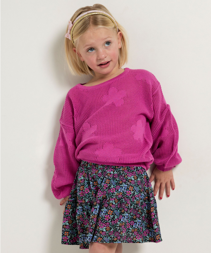 Trui voor meisjes. De trui is een oversized model en is voorzien van een ronde hals, afhangende schoudernaden, lange mouwen en ribgebreide boorden. Voorzien van een bloemgebreid patroon in een uni roze kleur. De trui heeft een wijde pasvorm en draagt comfortabel dankzij de zachte stoffenmix.