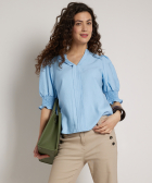 T-shirt voor dames. Het shirt is voorzien van een ronde hals met v-hals uitloop en korte pofmouwen met gesmockte boorden. Verfraaid met een uni blauwe kleur. Het t-shirt heeft een rechtvallende pasvorm en draagt comfortabel dankzij de luchtige stof.