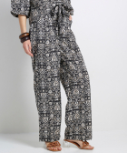 Broek voor dames. De broek is voorzien van een elastische tailleboord met strikceintuur en broekzakken. Verfraaid met een all-over witte print op een zwarte kleur. De broek heeft een wide fit pasvorm en draagt comfortabel dankzij de soepele stof.