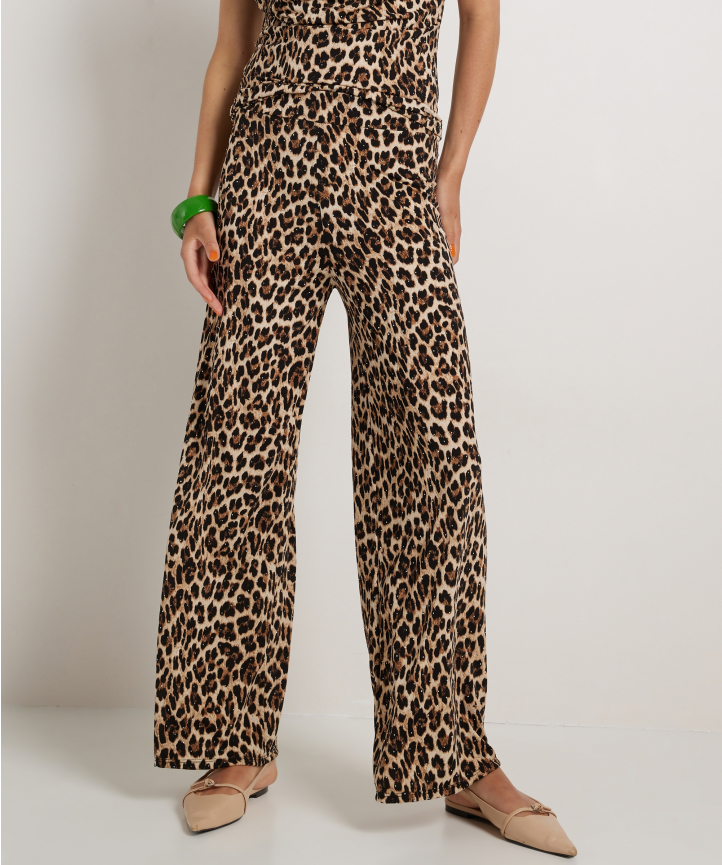 Broek voor dames. De broek is voorzien van een elastische tailleboord. Verfraaid met een all-over panterprint in bruine tinten en all-over kleine strasssteentjes voor een glittereffect. De broek heeft een wide fit pasvorm en draagt comfortabel dankzij de stretch.
